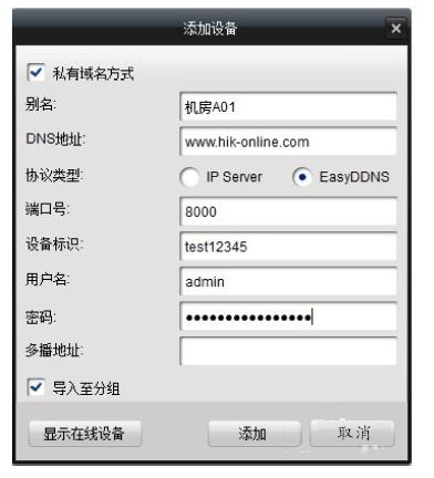 選擇私有域名方式添加,協議類型選擇成??礑DNS,填寫設備域名、用戶名、密碼,即可正常使用iVMS-4200客戶端軟件訪問設備。