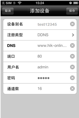 打開iVMS-4500手機客戶端,進入“設備管理”界面添加設備。設備別名處輸入注冊的設備域名(例如test12345),注冊類型選擇DDNS,DNS地址默認為www.hik-online.com,端口為80(固定填寫),輸入設備用戶名密碼,保存之后即可進入預覽界面預覽。