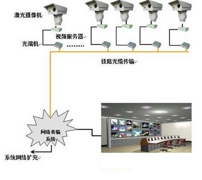 時(shí)下,這些設(shè)備已在鐵路安防監(jiān)控系統(tǒng)中發(fā)揮實(shí)質(zhì)性的作用,相關(guān)方案已用于太原鐵路局(1000余套)、武漢鐵路局宜萬線、廣深鐵路沿線、廣坪鐵路沿線等線路,徹底克服了夜間監(jiān)控效果差等諸多問題,實(shí)現(xiàn)了24小時(shí)全天候視頻安全監(jiān)控。總體實(shí)施方案系統(tǒng)結(jié)構(gòu)示意圖如下圖4所示。